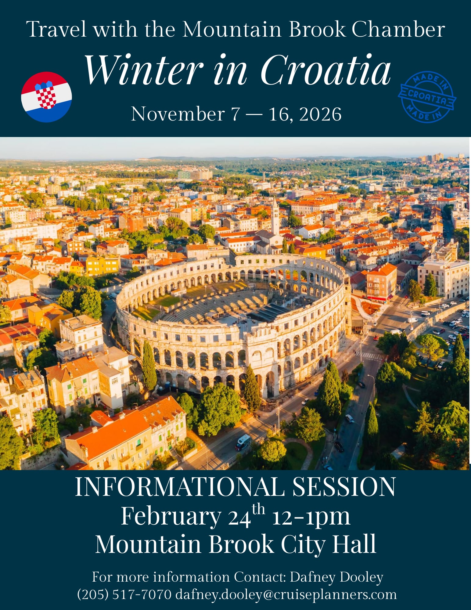 We’re excited to invite you to an Informational Session about the upcoming “Croatia in Winter” trip on Tuesday, February 24th from 12:00 PM to 1:00 PM in the Mountain Brook City Council Chambers at City Hall. This session will cover details about a 10-day winter tour of Croatia, including stops like Plitvice Lakes National Park, Opatija, Pula Arena, Zadar, Split, and more, as well as what’s included in the trip, itinerary highlights, and how to register. If exploring cascading lakes, historic Roman sites, and charming seaside towns sounds like your kind of adventure, this session is for you.Images